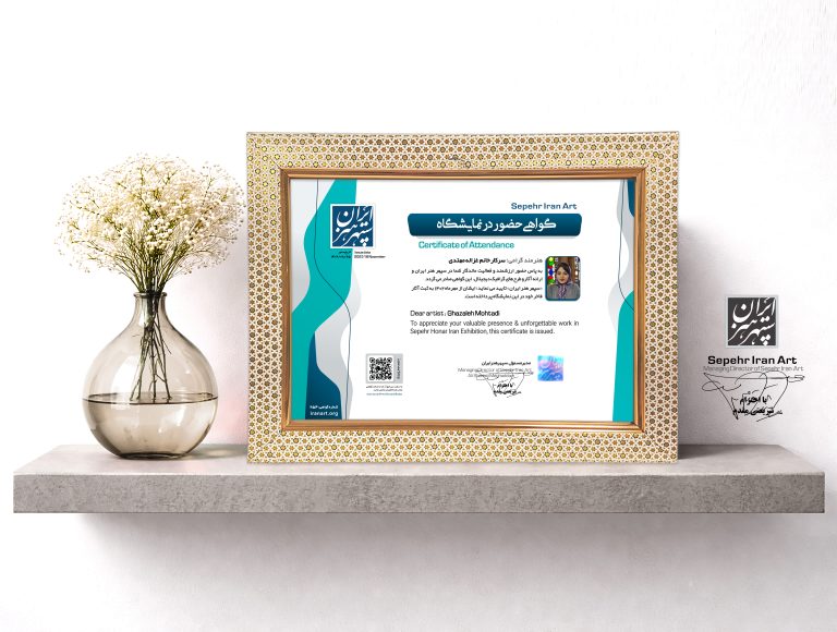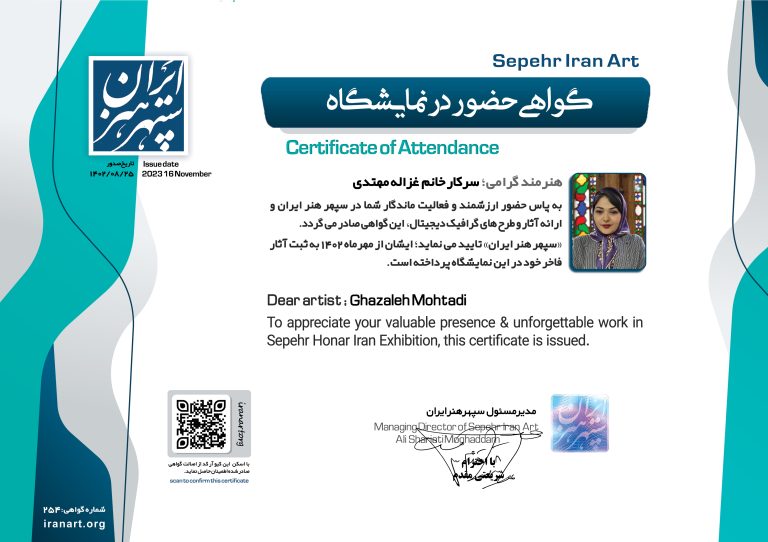 – این گواهی دارای QRcode اختصاصی و ویژه شما هنرمند گرامی در سامانه «نمایشگاه هنر ایران» بوده که به راحتی قابل راستی آزمایی است.