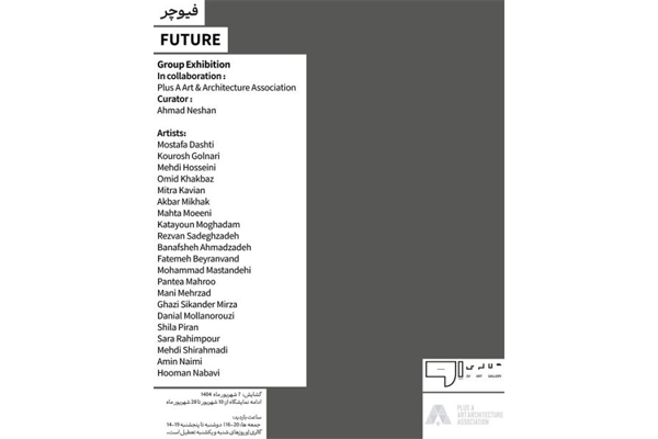 رویداد فیـوچر، یک رویداد هنری گروهی و نه صرفاً نمایشگاه، از جمعه ۷ شهریور تا جمعه ۲۸ شهریور ۱۴۰۴ در گالری اِو واقع در خیابان کریمخان زند—خیابان خردمند شمالی، کوچه اعرابی ۳، پلاک ۵ (طبقات همکف و اول) برگزار میشود.