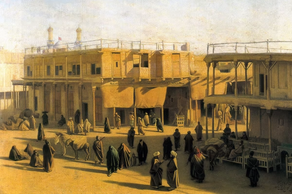 این تابلو میدان کربلا را در زمان قاجار به تصویر میکشد؛ جایی که معماری سنتی، سقفهای چوبی و فضاهای باز، همراه با مردم و فعالیتهای روزمره، جلوهای زنده و واقعگرایانه دارند.