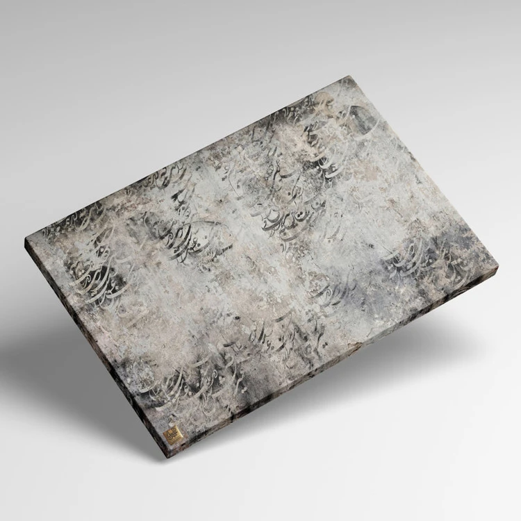 زمینه: زمینه خاکستری رنگ و بافت دار تابلو، حس کهنگی و قدمت را القا میکند و به نوعی به ریشههای هنر ایرانی اشاره دارد. این زمینه، فضایی مناسب برای نمایش خطوط زیبای نستعلیق فراهم کرده است.