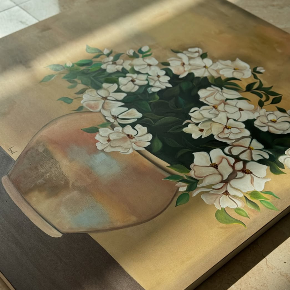 تابلو رنگ روغن گلدان گل روی بوم با استفاده از ضربه‌قلم‌های برجسته، رنگ‌های زنده و ترکیب‌بندی کلاسیک، جلوه‌ای شاعرانه و آرامش‌بخش به فضا می‌بخشد. هنرمند با دقت در چینش گل‌ها و سایه‌روشن‌های هنرمندانه، عمقی طبیعی و سه‌بعدی ایجاد کرده که نگاه بیننده را به سمت جزئیات لطیف اثر جذب می‌کند. بافت رنگ روغن در این تابلو احساس تازگی و لطافت گل‌ها را تقویت کرده و آن را به نقطه کانونی زیبا در هر محیط تبدیل می‌کند.