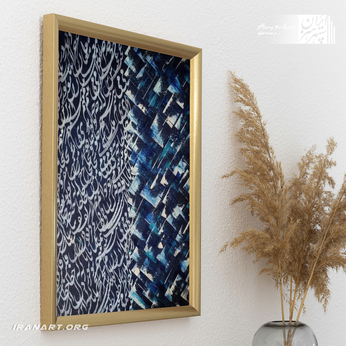 در کنار این ظرافت خطاطی، بخش انتزاعی اثر با رنگهای آبی، سرمهای و سفید، بافتی مدرن و پرانرژی ایجاد کرده که تضادی دلنشین با آرامش خوشنویسی دارد. تلاقی این دو جهان یکی ریشهدار در سنت و دیگری آزاد از هر قاعده تابلو را به اثری معاصر و منحصربهفرد تبدیل کرده است. این نقاشیخط نه تنها جلوهای زیباشناسانه برای دکوراسیون فضاهای هنری و مدرن فراهم میکند، بلکه پلی میان فرهنگ، احساس و هنر امروز است.
