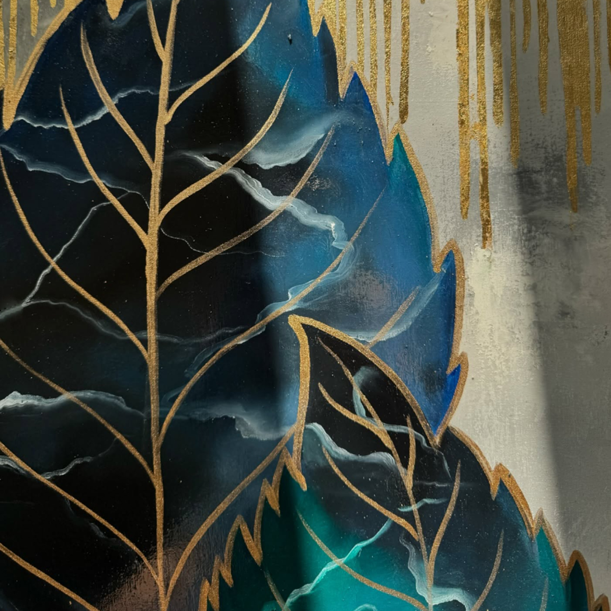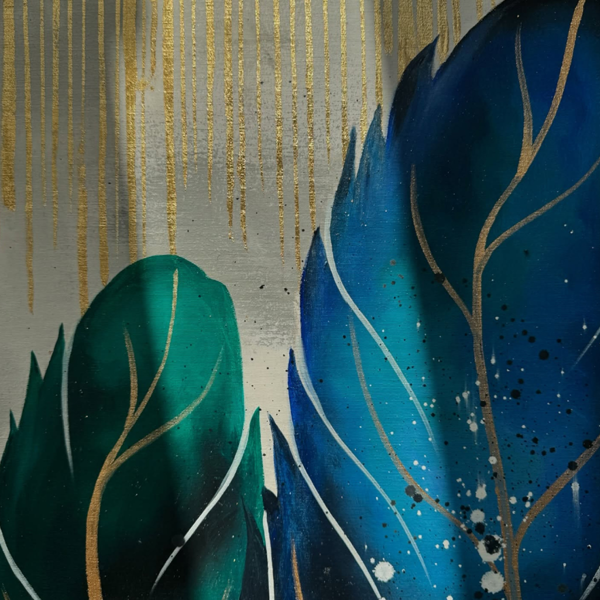 ترکیب رنگ روغن و اکریلیک امکان ایجاد لایههای رنگی غنی و بافتهای متفاوت را فراهم کرده است. رنگ روغن برای عمق و غنای رنگ و رنگ اکریلیک برای شفافیت و پویایی استفاده شده است. بافتها و لایهبندیها، جلوهای زنده و مدرن به اثر داده و تجربه بصری متفاوتی در نورهای مختلف ارائه میکند. اجرای سهتکه تابلو، امکان چیدمان انعطافپذیر و تغییر زاویه دید را به بیننده میدهد.