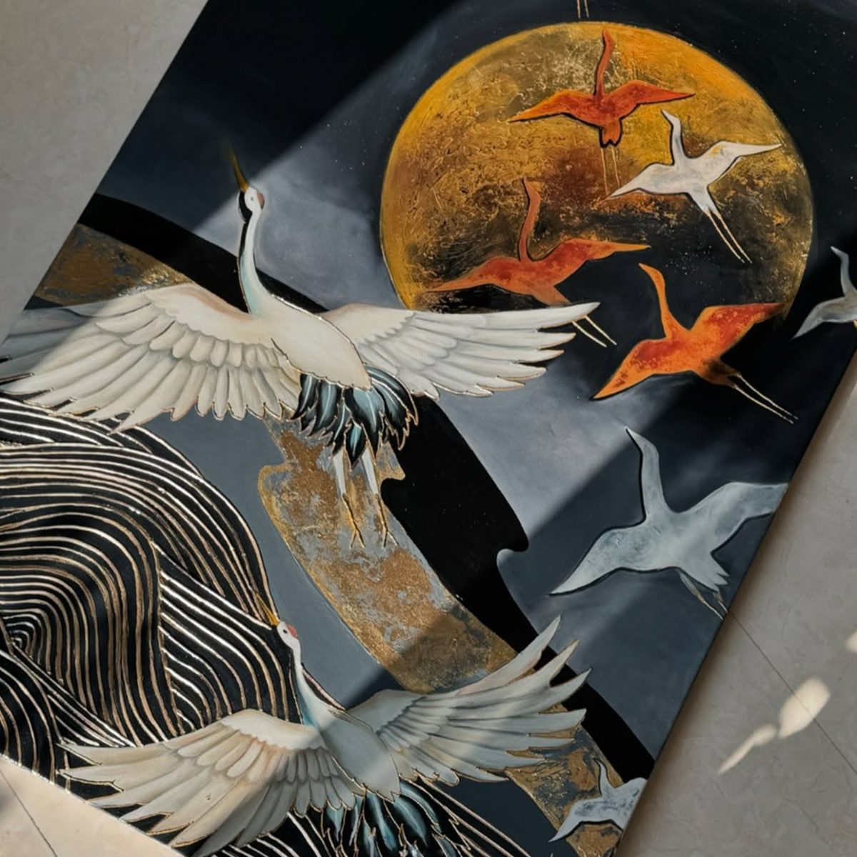 تابلو نقاشی رنگ روغن و تکسچر «پرواز لک‌لک‌ها»؛ اثری مدرن با بافت برجسته و فضایی الهام‌گرفته از طبیعت، مناسب دکوراسیون آرام و معاصر.