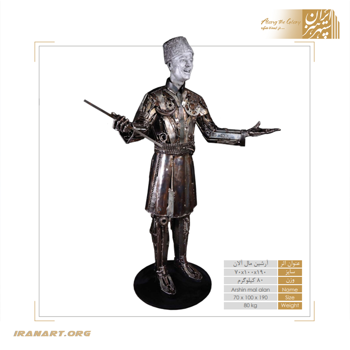 مجسمه فلزی فیگور انسان، که با دقت و طراحی هنرمندانه اجرا شده است. استفاده از فلز به‌عنوان متریال اصلی، استحکام و ظرافت اثر را همزمان تأمین می‌کند و خطوط ساده و متعادل آن، حس پویایی و تمرکز را منتقل می‌کند. اجرای دستی این اثر باعث می‌شود هر مجسمه هویتی مستقل و هنری داشته باشد.